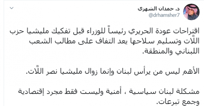 وكتب عبر تغريدة له على "تويتر" رصدها " المشهد العربي": "اقتراحات عودة الحريري رئيساً للوزراء قبل تفكيك مليشيا حزب اللَّات وتسليم سلاحها يعد التفافا على مطالب الشعب اللبناني والمنطقة،الأهم ليس من يرأس لبنان وإنما زوال مليشيا نصر اللَّات، مشكلة لبنان سياسية ،أمنية وليست فقط مجرد اقتصادية وجمع تبرعات".