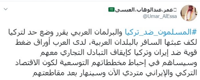 وكتب عبر تغريدة له على "تويتر" رصدها " المشهد العربي": "المسلمون ضد تركيا والبرلمان العربي يقرر وضع حد لتركيا لكف عبثها السافر بالبلدان العربية، لدى العرب أوراق ضغط قوية ضد إيران وتركيا كإيقاف التبادل التجاري معهم وسيساهم في إحباط مخططاتهم التوسعية لكون الاقتصاد التركي والإيراني متردي الآن وسينهار بعد مقاطعتهم".
