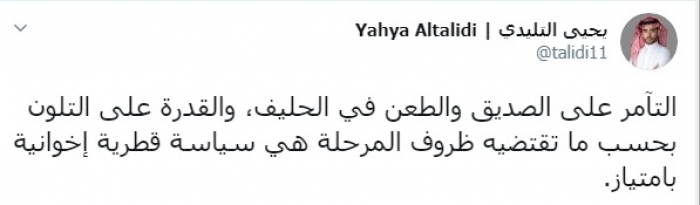 وكتب عبر تغريدة له على "تويتر" رصدها " المشهد العربي": "التآمر على الصديق والطعن في الحليف، والقدرة على التلون بحسب ما تقتضيه ظروف المرحلة هي سياسة قطرية إخوانية بامتياز".