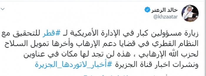 وكتب عبر تغريدة له على "تويتر" رصدها " المشهد العربي": "زيارة مسؤولين كبار في الإدارة الأمريكية لقطر للتحقيق مع النظام القطري في قضايا دعم الإرهاب وأخرها تمويل السلاح لحزب الله الإرهابي ، هذه لن تجد لها مكان في عناوين ونشرات أخبار قناة الجزيرة".