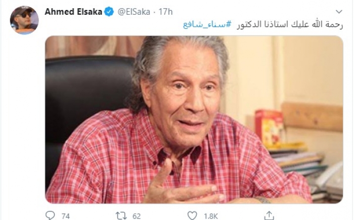 وغرد "السقا" عبر حسابه بـ"تويتر"، حول الوفاة قائلًا: "رحمة الله عليك أستاذنا الدكتور سناء شافع".