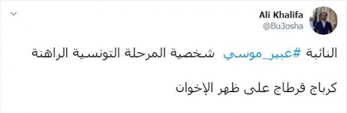 وكتب عبر تغريدة له على "تويتر" رصدها" المشهد العربي": " النائبة عبير موسي شخصية المرحلة التونسية الراهنة، كرباج قرطاج على ظهر الإخوان".