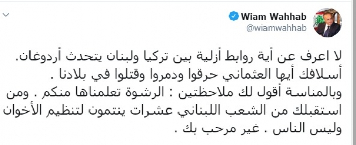 وكتب عبر تغريدة له على "تويتر" رصدها " المشهد العربي": "لا أعرف عن أية روابط أزلية بين تركيا ولبنان يتحدث أردوغان، أسلافك أيها العثماني حرقوا ودمروا وقتلوا في بلادنا، وبالمناسبة أقول لك ملاحظتين : الرشوة تعلمناها منكم، ومن استقبلك من الشعب اللبناني عشرات ينتمون لتنظيم الإخوان وليس الناس، غير مرحب بك".