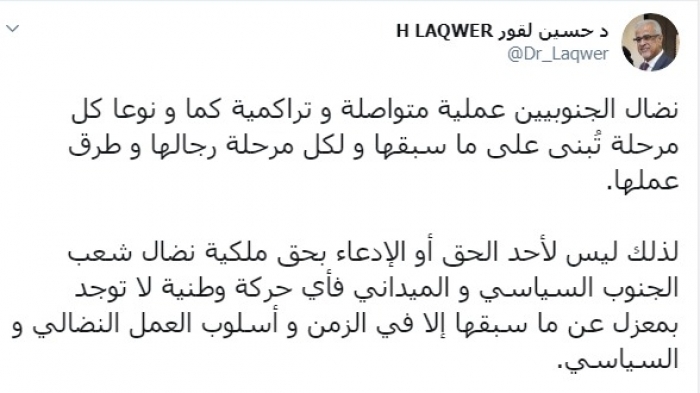 وكتب عبر تغريدة له على "تويتر" رصدها " المشهد العربي": "نضال الجنوبيين عملية متواصلة و تراكمية كما و نوعا كل مرحلة تُبنى على ما سبقها و لكل مرحلة رجالها و طرق عملها، لذلك ليس لأحد الحق أو الادعاء بحق ملكية نضال شعب الجنوب السياسي و الميداني فأي حركة وطنية لا توجد بمعزل عن ما سبقها إلا في الزمن و أسلوب العمل النضالي و السياسي".