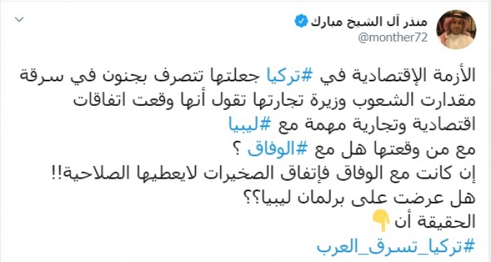 وكتب عبر تغريدة له على "تويتر" رصدها " المشهد العربي": "الأزمة الاقتصادية في تركيا جعلتها تتصرف بجنون في سرقة مقدرات الشعوب وزيرة تجارتها تقول أنها وقعت اتفاقات اقتصادية وتجارية مهمة مع ليبيا