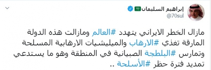 دعا الكاتب السعودي إبراهيم السليمان، اليوم الخميس، إلى تمديد حظر السلاح المفروض على إيران بسبب دعمها للمليشيات الإرهابية.