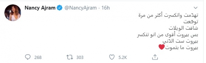 وغردت نانسي عجرم عبر حسابها بـ"تويتر"، قائلة: "تهدّمت واتكسرت أكتر من مرة. توجّعت. شافت الويلات، بس بيروت أقوى من أنها تنكسر بيروت ست الدّنيا، بيروت ما بتموت".