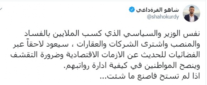 وكتب عبر تغريدة له على "تويتر" رصدها " المشهد العربي":"نفس الوزير والسياسي الذي كسب الملايين بالفساد والمنصب واشترى الشركات والعقارات ، سيعود لاحقاً عبر الفضائيات للحديث عن الازمات الاقتصادية وضرورة التقشف وينصح المواطنين في كيفية إدارة رواتبهم، إذا لم تستح فاصنع ما شئت".