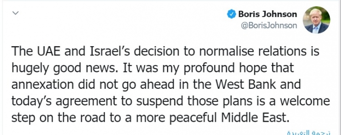 وأضاف جونسون في تغريدة نشرها عبر حسابه الرسمي بـ"تويتر" رصدها" المشهد العربي": "كنت آمل ألا يتم المضي قدما في الضم بالضفة الغربية، واتفاق اليوم لتعليق الأمر خطوة مرحب بها على الطريق نحو شرق أوسط أكثر سلامًا".