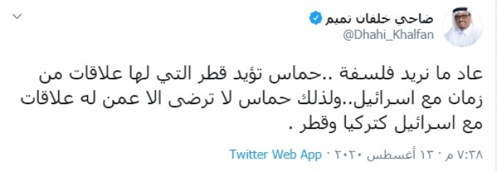 وكتب "خلفان" تغريدة بتويتر، رصدها "المشهد العربي": "عاد ما نريد فلسفة ..حماس تؤيد قطر التي لها علاقات من زمان مع إسرائيل..ولذلك حماس لا ترضى إلا عمن له علاقات مع إسرائيل كتركيا وقطر" .