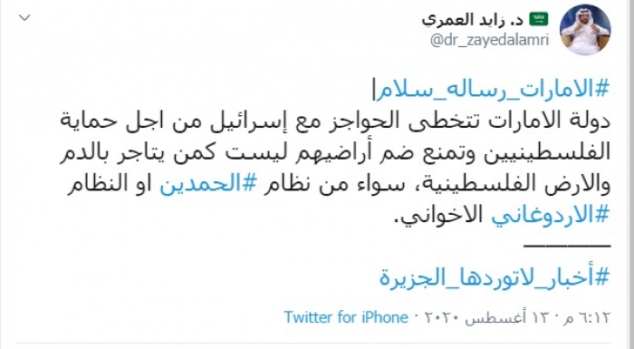 وكتب "العمري" في تغريدة عبر تيوتر، رصدها "المشهد العربي": "دولة الإمارات تتخطى الحواجز مع إسرائيل من أجل حماية الفلسطينيين وتمنع ضم أراضيهم ليست كمن يتاجر بالدم والأرض الفلسطينية، سواء من نظام الحمدين أو النظام الأردوغاني الإخواني".