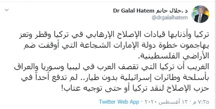 وكتب "حاتم" في تغريدة عبر تويتر، رصدها "المشهد العربي": "تركيا وأذنابها قيادات الإصلاح الإرهابي في تركيا وقطر وتعز يهاجمون خطوة دولة الإمارات الشجاعة التي أوقفت ضم الأراضي الفلسطينية".
