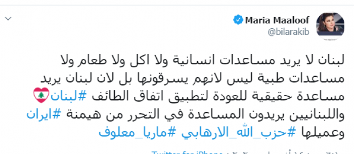 وكتبت عبر تغريدة لها على "تويتر" رصدها " المشهد العربي": "لبنان لا يريد مساعدات إنسانية ولا أكل ولا طعام ولا مساعدات طبية ليس لأنهم يسرقونها بل لأن لبنان يريد مساعدة حقيقية للعودة لتطبيق اتفاق الطائف، لبنان واللبنانيين يريدون المساعدة في التحرر من هيمنة إيران وعميلها حزب الله الإرهابي".