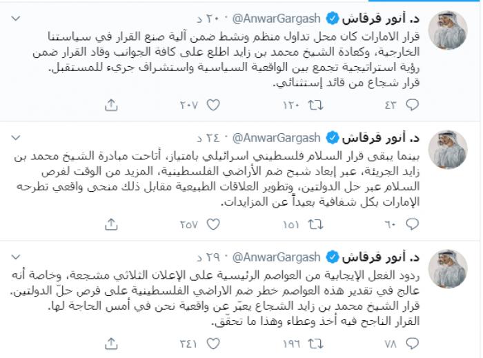 وكتب عبر تغريدات له على "تويتر" رصدها " المشهد العربي":"ردود الفعل الإيجابية من العواصم الرئيسية على الإعلان الثلاثي مشجعة، وخاصة أنه عالج في تقدير هذه العواصم خطر ضم الأراضي الفلسطينية على فرص حلّ الدولتين، قرار الشيخ محمد بن زايد الشجاع يعبّر عن واقعية نحن في أمس الحاجة لها، القرار الناجح فيه أخذ وعطاء وهذا ما تحقّق".