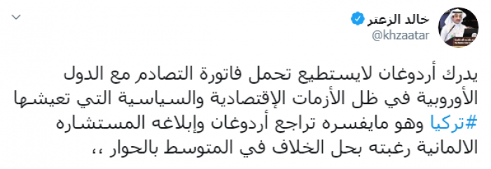 وكتب عبر تغريدة له على "تويتر" رصدها " المشهد العربي": "يدرك أردوغان أنه لا يستطيع تحمل فاتورة التصادم مع الدول الأوروبية في ظل الأزمات الاقتصادية والسياسية التي تعيشها تركيا وهو ما يفسره تراجع أردوغان وإبلاغه المستشارة الألمانية رغبته بحل الخلاف في المتوسط بالحوار".