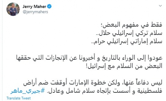 وكتب في تغريدة عبر "تويتر" رصدها "المشهد العربي": "فقط في مفهوم البعض؛ سلام تركي إسرائيلي حلال.. سلام إماراتي إسرائيلي حرام.. عودوا إلى الوراء بالتاريخ و أخبرونا عن الإنجازات التي حققها البعض من السلام مع إسرائيل".