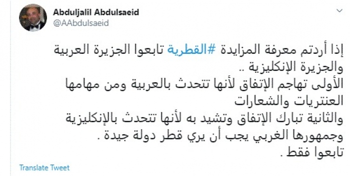 وقال في تغريدة عبر "تويتر" رصدها "المشهد العربي": "إذا أردتم معرفة المزايدة القطرية تابعوا الجزيرة العربية والجزيرة الإنكليزية".