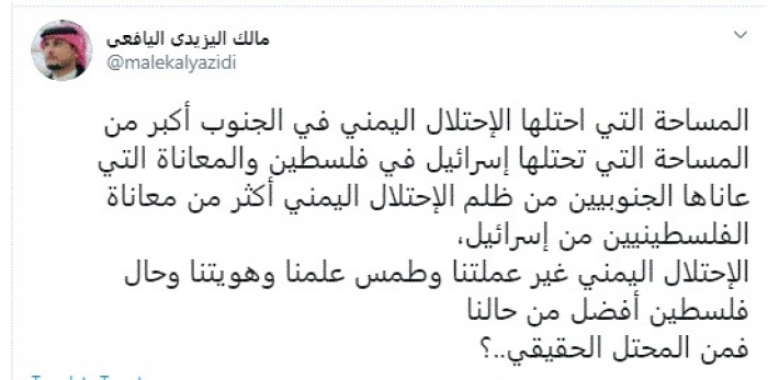 وقال في تغريدة عبر "تويتر" رصدها "المشهد العربي": "المساحة التي احتلها الاحتلال اليمني في الجنوب أكبر من المساحة التي تحتلها إسرائيل في فلسطين والمعاناة التي عاناها الجنوبيين من ظلم الاحتلال اليمني أكثر من معاناة الفلسطينيين من إسرائيل".