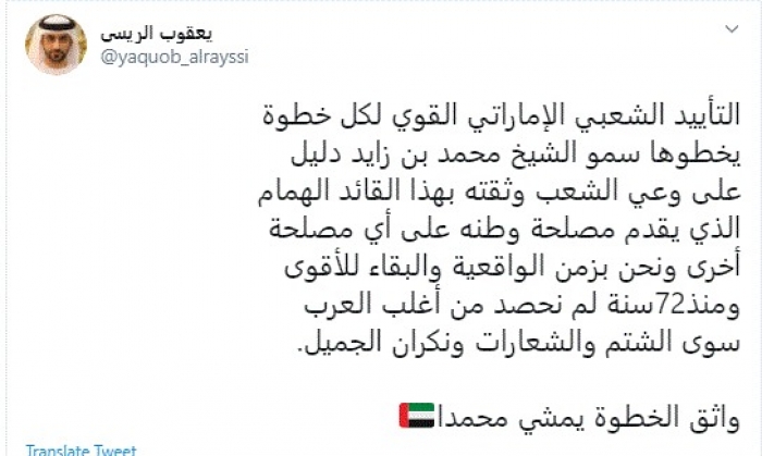 وقال في تغريدة عبر "تويتر" رصدها "المشهد العربي": "التأييد الشعبي الإماراتي القوي لكل خطوة يخطوها سمو الشيخ محمد بن زايد دليل على وعي الشعب وثقته بهذا القائد الهمام الذي يقدم مصلحة وطنه على أي مصلحة أخرى ونحن بزمن الواقعية والبقاء للأقوى ومنذ 72 سنة لم نحصد من أغلب العرب سوى الشتم والشعارات ونكران الجميل.. واثق الخطوة يمشي محمدًا".