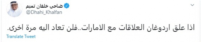 وقال في تغريدة عبر "تويتر" رصدها "المشهد العربي": "إذا علق أردوغان العلاقات مع الإمارات.. فلن تعاد إليه مرة أخرى".