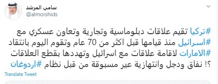 وقال في تغريدة عبر "تويتر" رصدها "المشهد العربي": "تركيا تقيم علاقات دبلوماسية وتجارية وتعاون عسكري مع إسرائيل منذ قيامها قبل أكثر من 70 عام وتقوم اليوم بانتقاد الإمارات لإقامة علاقات مع اسرائيل وتهددها بقطع العلاقات؟! نفاق ودجل وانتهازية عير مسبوقة من قبل نظام أردوغان".
