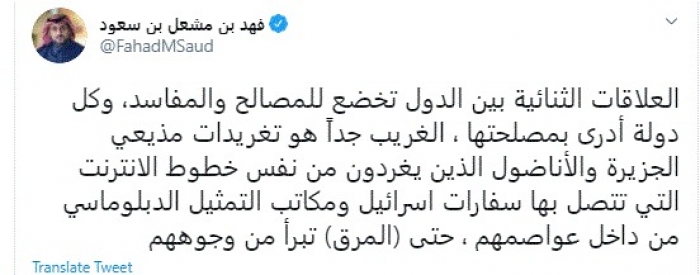 وقال في تغريدة عبر "تويتر" رصدها "المشهد العربي": "العلاقات الثنائية بين الدول تخضع للمصالح والمفاسد، وكل دولة أدرى بمصلحتها، الغريب جداً هو تغريدات مذيعي الجزيرة والأناضول الذين يغردون من نفس خطوط الانترنت التي تتصل بها سفارات إسرائيل ومكاتب التمثيل الدبلوماسي من داخل عواصمهم ، حتى (المرق) تبرأ من وجوههم".