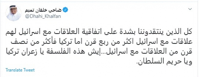 وقال في تغريدة عبر "تويتر" رصدها "المشهد العربي": "كل الذين ينتقدوننا بشدة على اتفاقية العلاقات مع إسرائيل لهم علاقات مع إسرائيل أكثر من ربع قرن أما تركيا فأكثر من نصف قرن من العلاقات مع اسرائيل...إيش هذه الفلسفة يا زعران تركيا ويا حريم السلطان".