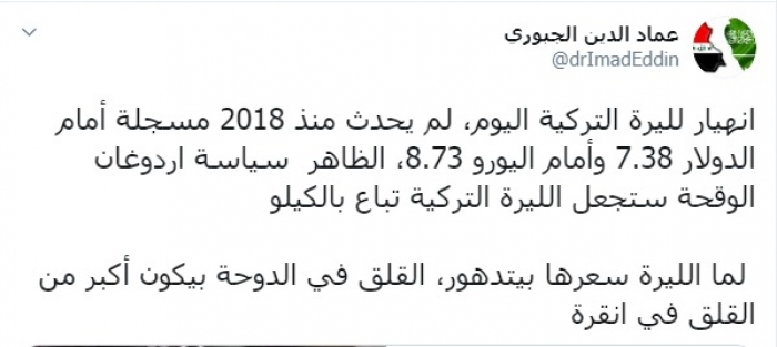 وكتب عبر تغريدة له على "تويتر" رصدها " المشهد العربي":"انهيار لليرة التركية اليوم، لم يحدث منذ 2018 مسجلة أمام الدولار 7.38 وأمام اليورو 8.73، الظاهر سياسة أردوغان الوقحة ستجعل الليرة التركية تباع بالكيلو، لما الليرة سعرها بيتدهور، القلق في الدوحة بيكون أكبر من القلق في أنقرة".