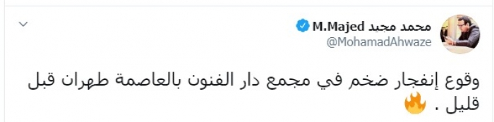 وكتب عبر تغريدة له على "تويتر" رصدها " المشهد العربي": "وقوع انفجار ضخم في مجمع دار الفنون بالعاصمة طهران قبل قليل".