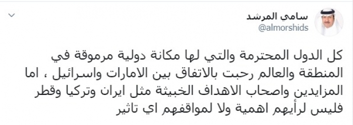 وكتب عبر تغريدة له على "تويتر" رصدها " المشهد العربي": "كل الدول المحترمة والتي لها مكانة دولية مرموقة في المنطقة والعالم رحبت بالاتفاق بين الإمارات وإسرائيل، أما المزايدين وأصحاب الأهداف الخبيثة مثل إيران وتركيا وقطر فليس لرأيهم أهمية ولا لمواقفهم أي تأثير".