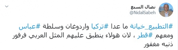 وكتب عبر تغريدة له على "تويتر" رصدها " المشهد العربي": "التطبيع خيانة ما عدا تركيا وأردوغان وسلطة عباس ومعهم قطر، لأن هؤلاء ينطبق عليهم المثل العربي فرفور ذنبه مغفور".