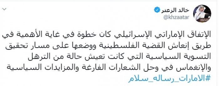 أكد المحلل السياسي السعودي خالد الزعتر، الجمعة، أن الاتفاق الإماراتي الإسرائيلي هو خطوة هامة لإنعاش القضية الفلسطينية.