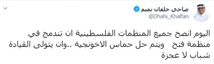وكتب عبر تغريدة له على "تويتر" رصدها " المشهد العربي": "اليوم انصح جميع المنظمات الفلسطينية أن تندمج في منظمة فتح، ويتم حل حماس الإخونجية ، وأن يتولى القيادة شباب لا عجزة".