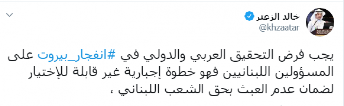 وكتب عبر تغريدة له على "تويتر" رصدها " المشهد العربي":"يجب فرض التحقيق العربي والدولي في انفجار بيروت على المسؤولين اللبنانيين، فهي خطوة إجبارية غير قابلة للاختيار لضمان عدم العبث بحق الشعب اللبناني".
