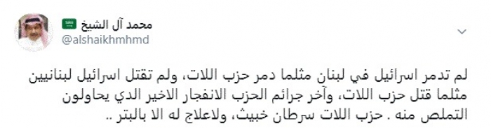 وقال في تغريدة عبر "تويتر" رصدها "المشهد العربي": "لم تدمر إسرائيل في لبنان مثلما دمر حزب اللات، ولم تقتل إسرائيل لبنانيين مثلما قتل حزب اللات، وآخر جرائم الحزب الانفجار الأخير الدي يحاولون التملص منه . حزب اللات سرطان خبيث، ولاعلاج له إلا بالبتر".