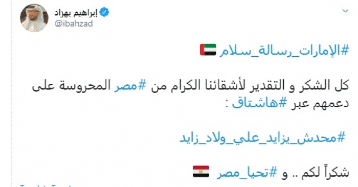 وقال في تغريدة عبر "تويتر" رصدها "المشهد العربي": "الإمارات رسالة سلام كل الشكر والتقدير لأشقائنا الكرام من مصر المحروسة على دعمهم عبر هاشتاق: محدش يزايد علي ولاد زايد شكراً لكم .. وتحيا مصر".