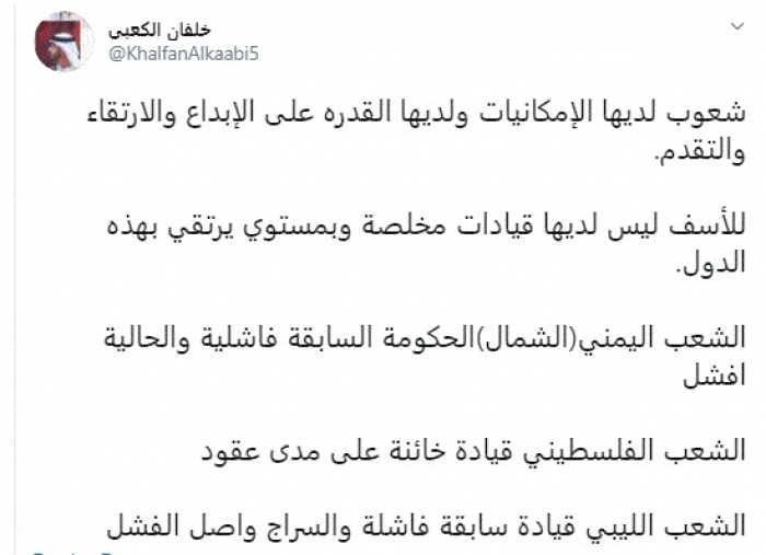 وقال في تغريدة عبر "تويتر" رصدها "المشهد العربي": "شعوب لديها الإمكانيات ولديها القدرة على الإبداع والارتقاء والتقدم. للأسف ليس لديها قيادات مخلصة وبمستوى يرتقي بهذه الدول".