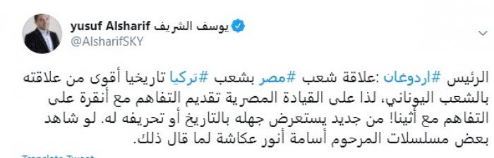 وقال في تغريدة عبر "تويتر" رصدها "المشهد العربي": "الرئيس أردوغان: علاقة شعب مصر بشعب تركيا تاريخيا أقوى من علاقته بالشعب اليوناني، لذا على القيادة المصرية تقديم التفاهم مع أنقرة على التفاهم مع أثينا! من جديد يستعرض جهله بالتاريخ أو تحريفه له. لو شاهد بعض مسلسلات المرحوم أسامة أنور عكاشة لما قال ذلك".