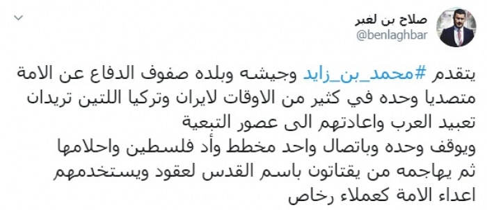 وكتب "بن لغبر" في تغريدة عبر تويتر، رصدها "المشهد العربي": "يتقدم محمد بن زايد، وجيشه وبلده صفوف الدفاع عن الأمة متصدياً وحده في كثير من الأوقات لإيران وتركيا اللتين تريدان تعبيد العرب وإعادتهم إلى عصور التبعية".