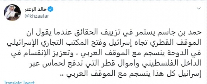 وقال في تغريدة عبر "تويتر" رصدها "المشهد العربي": "حمد بن جاسم يستمر في تزييف الحقائق عندما يقول ان الموقف القطري تجاه إسرائيل وفتح المكتب التجاري الإسرائيلي في الدوحة ينسجم مع الموقف العربي".