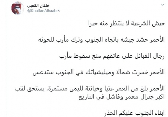 وقال في تغريدة عبر "تويتر" رصدها "المشهد العربي": "جيش الشرعية لا ينتظر منه خيرًا.. الأحمر حشد جيشه باتجاه الجنوب وترك مأرب للحوثة".