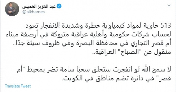 حذر الإعلامي السعودي عبدالعزيز الخميس، اليوم، من تكرار سيناريو انفجار مرفأ بيروت في ميناء بالبصرة.