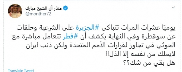 وأضاف: "وفي النهاية يكشف أن قطر تتعامل مباشرة مع الحوثي في تجاوز لقرارات الأمم المتحدة ولكن ذنب إيران لا يملك من نفسه إلا الذل".
