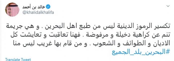 وقال في تغريدة عبر "تويتر" رصدها "المشهد العربي": "تكسير الرموز الدينية ليس من طبع أهل البحرين. وهي جريمة تنم عن كراهية دخيلة ومرفوضة. فهنا تعاقبت وتعايشت كل الأديان والطوائف والشعوب. ومن قام بها غريب ليس منا".