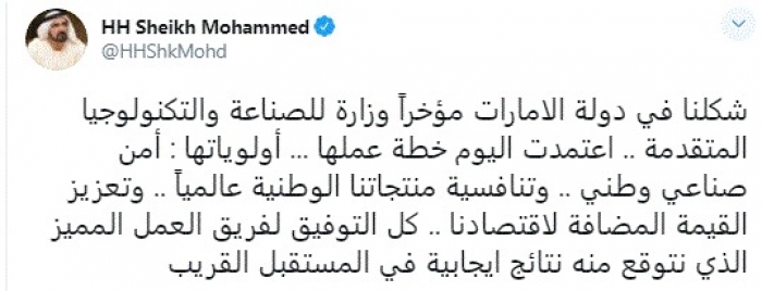وقال في تغريدة عبر "تويتر" رصدها "المشهد العربي": "شكلنا في دولة الامارات مؤخراً وزارة للصناعة والتكنولوجيا المتقدمة اعتمدت اليوم خطة عملها أولوياتها: أمن صناعي وطني.. وتنافسية منتجاتنا الوطنية عالمياً".