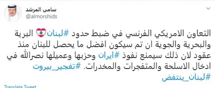 وقال في تغريدة عبر "تويتر" رصدها "المشهد العربي": "التعاون الأمريكي الفرنسي في ضبط حدود لبنان البرية والبحرية والجوية إن تم سيكون أفضل ما يحصل للبنان منذ عقود".