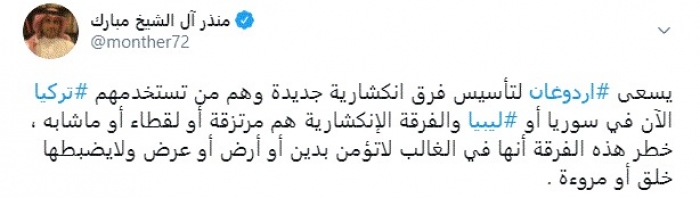 وقال في تغريدة عبر "تويتر" رصدها "المشهد العربي": "يسعى أردوغان لتأسيس فرق انكشارية جديدة وهم من تستخدمهم تركيا الآن في سوريا أو ليبيا والفرقة الانكشارية هم مرتزقة أو لقطاء أو ماشابه ، خطر هذه الفرقة أنها في الغالب لاتؤمن بدين أو أرض أو عرض ولايضبطها خلق أو مروءة".