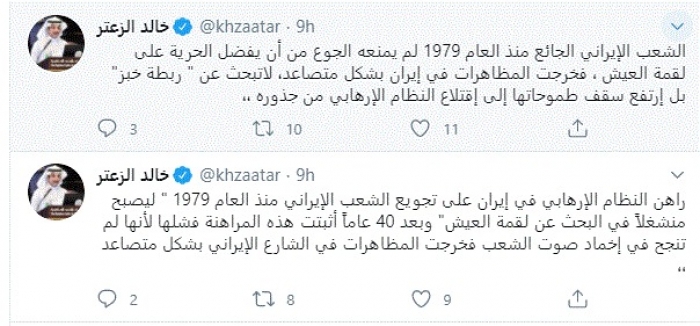 وقال في تغريدات عبر "تويتر" رصدها "المشهد العربي": "راهن النظام الإرهابي في إيران على تجويع الشعب الإيراني منذ العام 1979 ليصبح منشغلاً في البحث عن لقمة العيش وبعد 40 عاماً أثبتت هذه المراهنة فشلها لأنها لم تنجح في إخماد صوت الشعب فخرجت المظاهرات في الشارع الإيراني بشكل متصاعد".