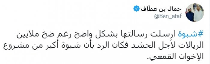 وكتب عبر تغريدة له على "تويتر" رصدها "المشهد العربي": "شبوة أرسلت رسالتها بشكل واضح رغم ضخ ملايين الريالات لأجل الحشد فكان الرد بأن شبوة أكبر من مشروع الإخوان القمعي".