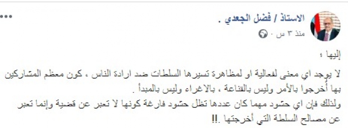 وكتب عبر تدوينة له على "فيس بوك" رصدها "المشهد العربي": "لا يوجد أي معنى لفعالية أو لمظاهرة تسيرها السلطات ضد إرادة الناس، كون معظم المشاركين بها أُخرجوا بالأمر وليس بالقناعة، بالإغراء وليس بالمبدأ، ولذلك فإن أي حشود مهما كان عددها تظل حشودا فارغة كونها لا تعبر عن قضية وإنما تعبر عن مصالح السلطة التي أخرجتها".